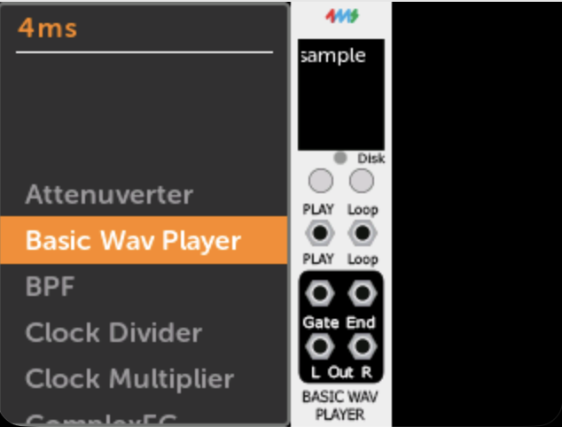 The Basic Wav Player is found in the 4ms brand in the module browser.