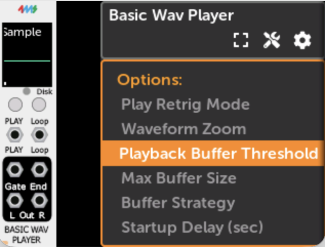 The Basic Wav Player (BWAVP) is a streaming .wav file player built into the MetaModule. Because it streams audio from disk, it can play files of any length without waiting to load the entire file into memory first. It also has advanced settings for optimizing simultaneous playback of multiple large samples.