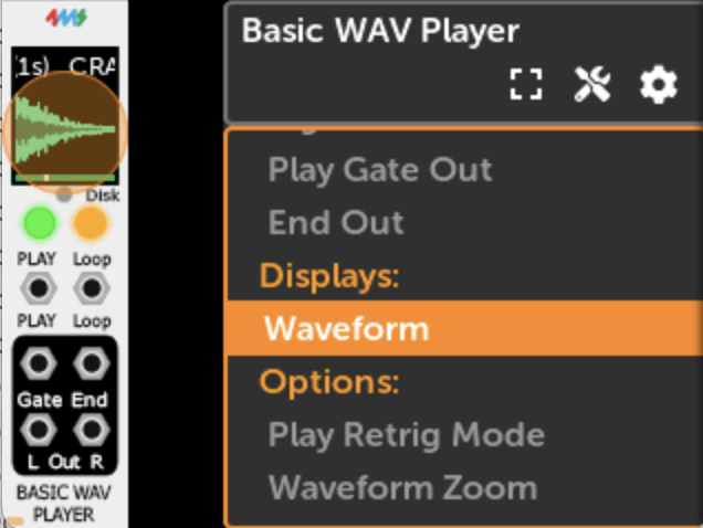 The module shows the sample waveform while playing. On the MetaModule, clicking on the Waveform Display will make it full-screen.