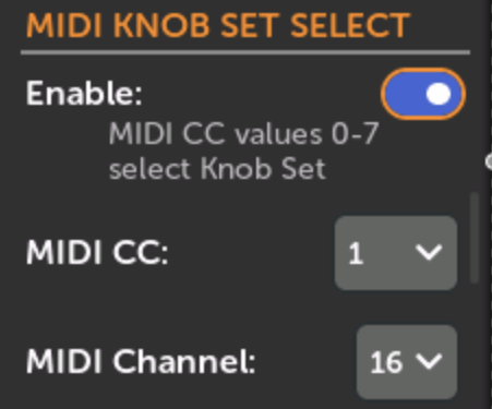 MIDI Knob Set Select lets you change the active Knob Set with a single MIDI CC message. When enabled, choose a MIDI Channel and CC# — sending a value of 0–7 on that channel and CC# will immediately switch to the 1st through 8th Knob Set (CC value 0 → Knob Set 1, 1 → Knob Set 2, …, 7 → Knob Set 8).